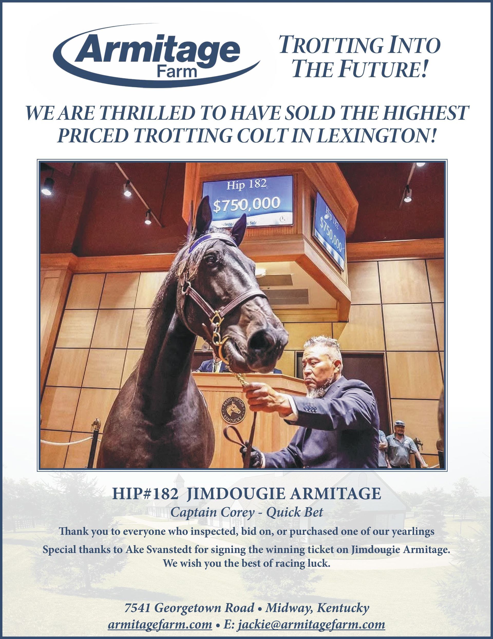 Armitage Farm is a privately owned, full-scale commercial breeding operation. Every yearling in our consignment is proudly bred, raised, and prepared by Armitage Farm. Our entire crop is offered exclusively through public auction, with each horse brought to market to be sold—not merely appraised. Buyers can feel confident knowing that we are not selling culls, nor do we enter the sales ring with unrealistic expectations regarding price.